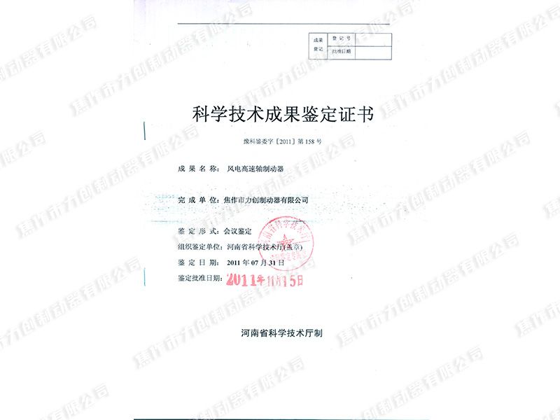公司于2005年通過ISO9001質(zhì)量管理體系認(rèn)證,2011年通過了安標(biāo)國(guó)家礦用產(chǎn)品認(rèn)證審核,并取得防爆合格證與煤安證,先后被焦作市評(píng)定為高新技術(shù)企業(yè)、中小科技型企業(yè)、焦作市風(fēng)電制動(dòng)器工程技術(shù),公司于2008年取得了風(fēng)電高速軸制動(dòng)器與偏航制動(dòng)器兩項(xiàng)專利,2011年獲得風(fēng)電高速軸制動(dòng)器與SBD系列制動(dòng)器兩項(xiàng)河南省科技進(jìn)步二等獎(jiǎng)
